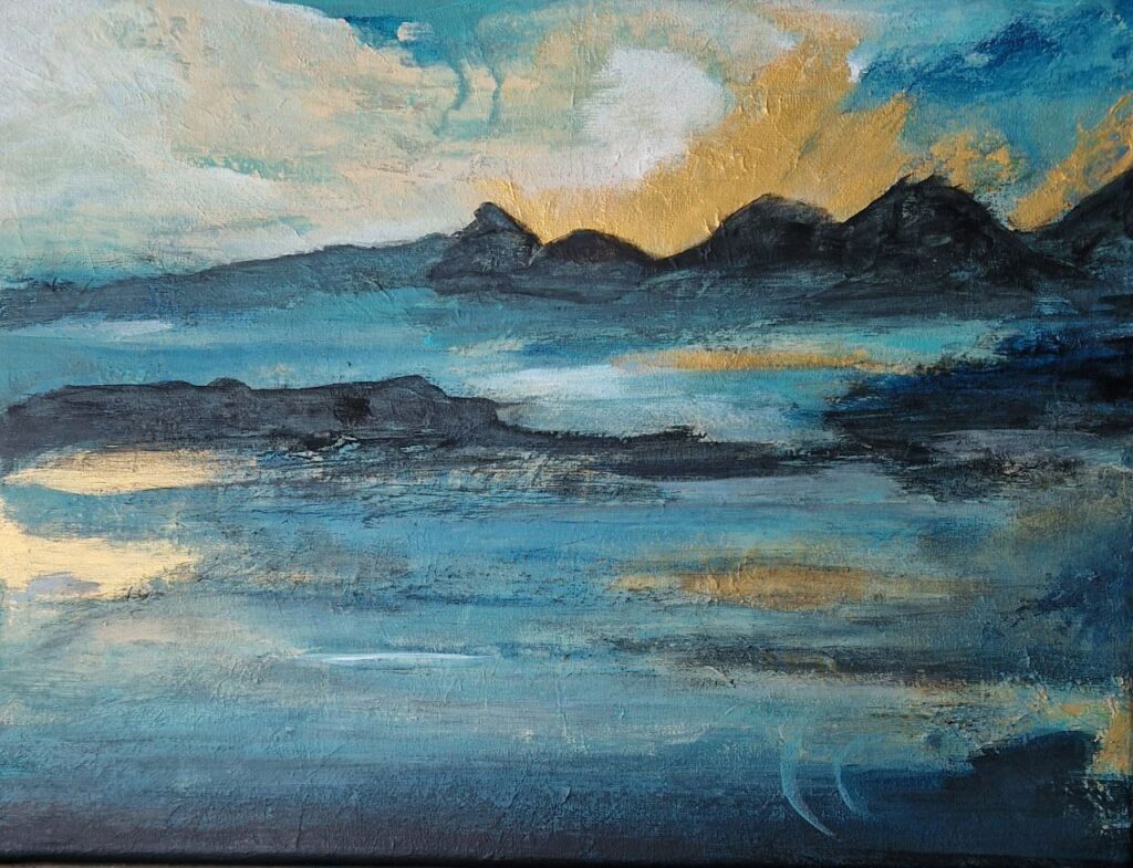Für mich wirkt die abstrakte Treppe, die mitten durch das Gemälde führt, wie eine Einladung auf eine Entdeckungsreise durchs Leben. Ein Weg der Weiterentwicklung und des Wachstums. Eine Reise zu sich selbst.